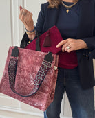 Everyone loves our Luxe North-South Bag! A perfect bag for everyday or travel. It's easy to carry work essentials like your computer etc.  Inside you'll find pockets on both sides to keep your things organized. Made of beautiful an durable crushed velvet with metal feet on the bottom, vegan leather handles and snap closures!